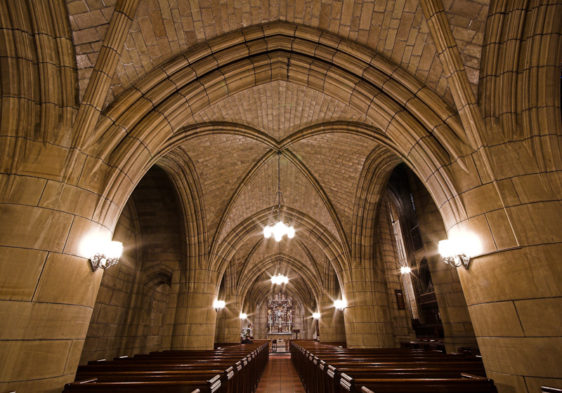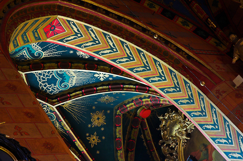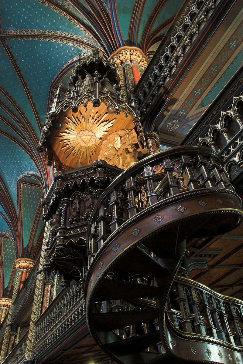 the church's gothic revival architecture is among the most dramatic in the world; its interior is grand and colourful, its ceiling is coloured deep blue and decorated with golden stars, and the rest of the sanctuary is a polychrome of blues, azures, reds, purples, silver, and gold. it is filled with hundreds of intricate wooden carvings and several religious statues. unusual for a church, the stained glass windows along the walls of the sanctuary do not depict biblical scenes, but rather scenes from the religious history of montreal.