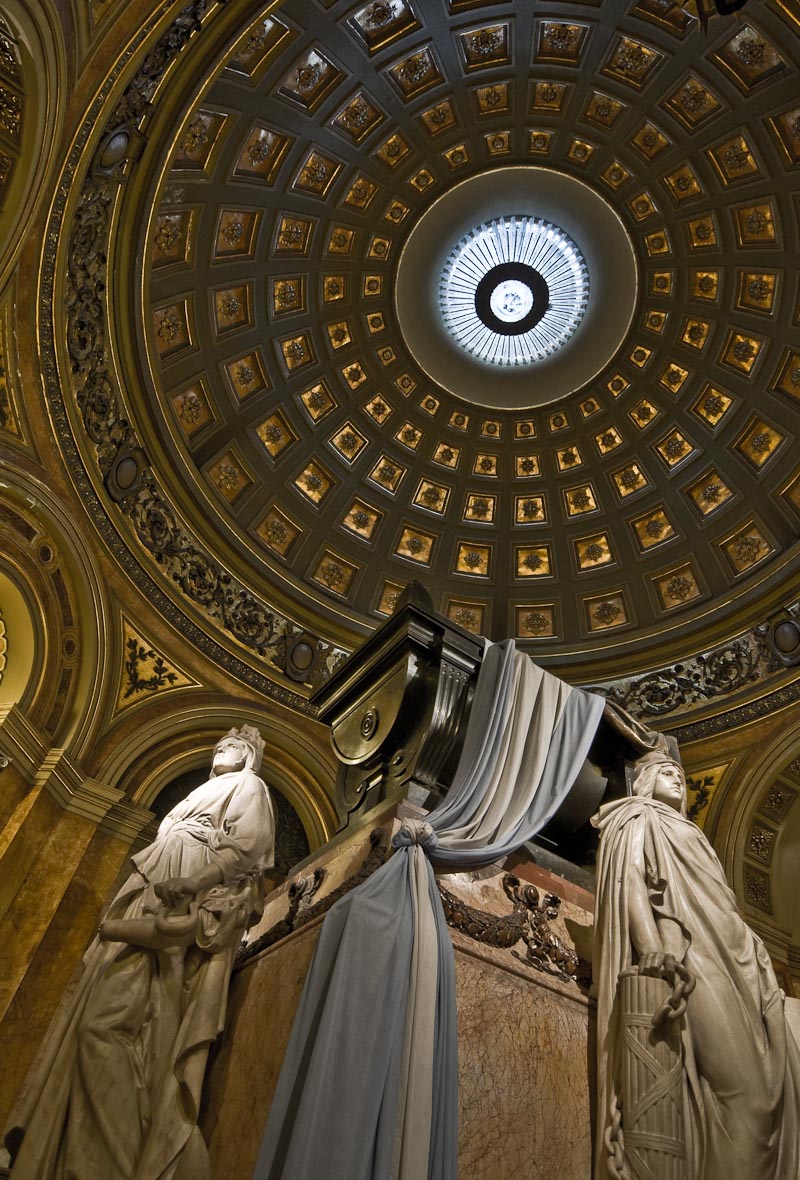 this particular photograph depicts the mausoleum of general san martín, guarded by statues representing argentina, peru and chile.