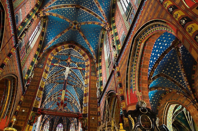 a.k.a. church of our lady assumed into heaven, this st-mary's church is a brick gothic church re-built in the 14th century adjacent to the main market aquare in kraków. on every hour, a trumpet signal—called the hejnał mariacki—is played from the top of the taller of st. mary's two towers. the plaintive tune breaks off in mid-stream, to commemorate the famous 13th century trumpeter, who was shot in the throat while sounding the alarm before the mongol attack on the city.