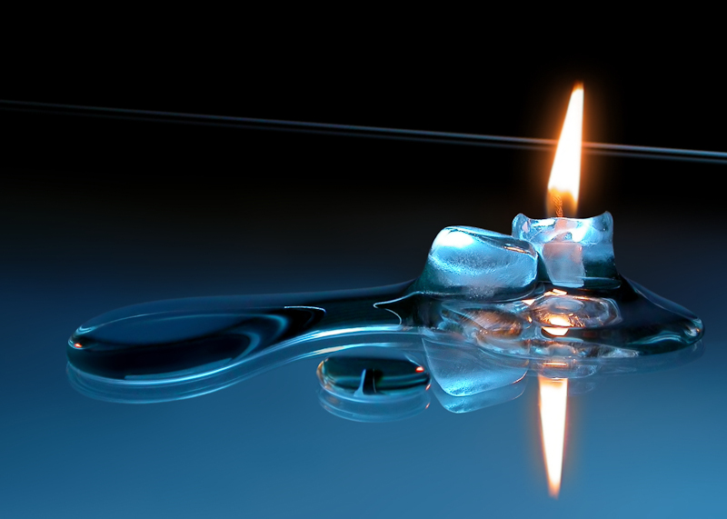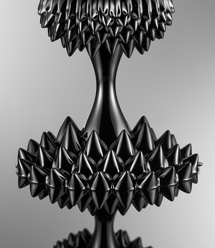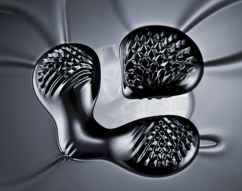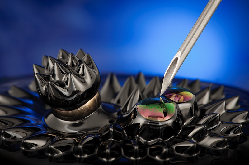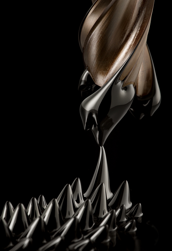 this photograph demonstrates the magnetic properties of this liquid as it shape shifts under the magnetic field setup by two carefully positioned rare-earth disc magnets. one magnet lies below a silicon wafer, while the other hangs from above. the protruding cones are a result of the compromise between the minimization of magnetic energy versus the minimization of surface free energy.