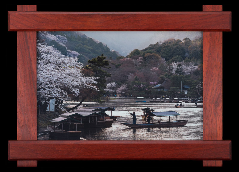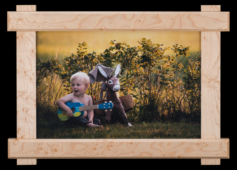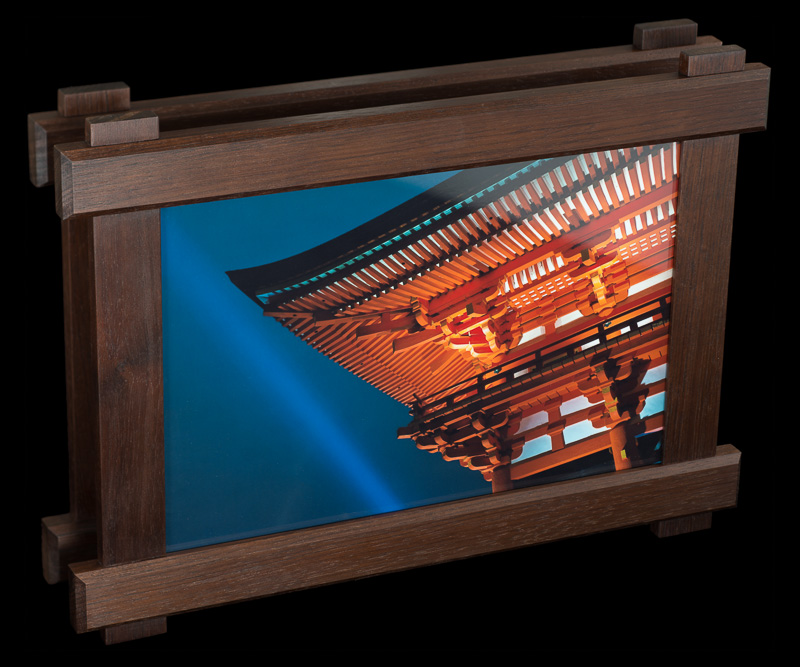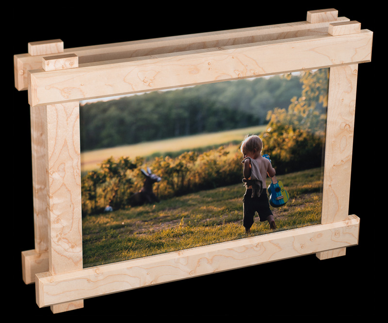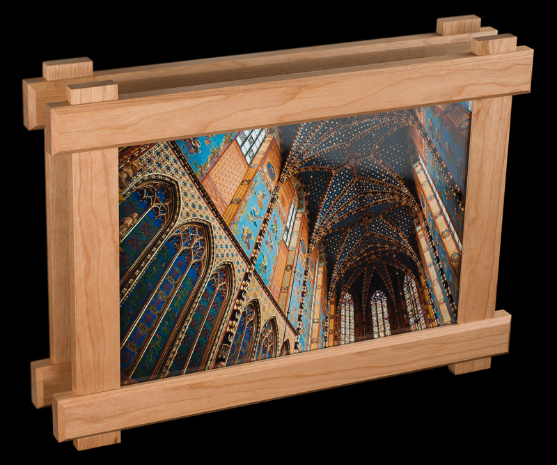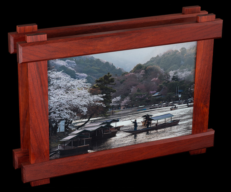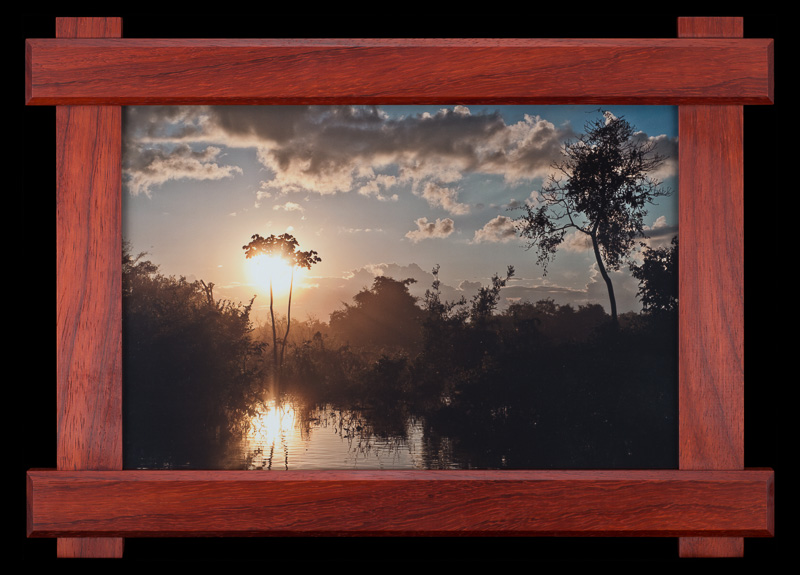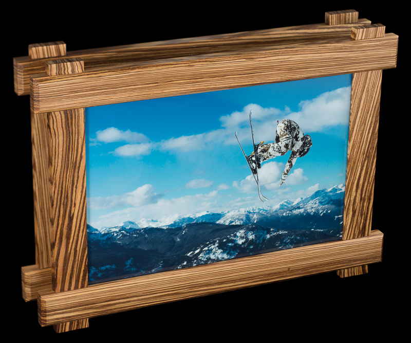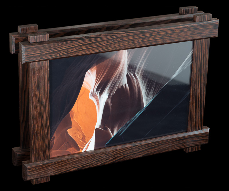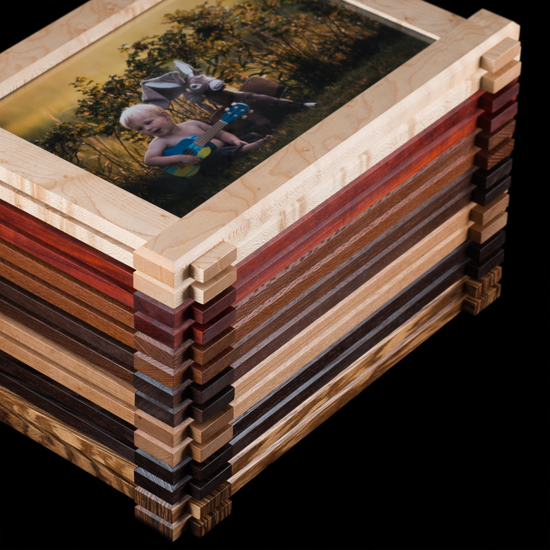 these pairs of picture frames were manufactured in parallel out of 7 types of hardwoods: bird's eye maple, padauk, lacewood, african walnut, cherry, wenge, and zebrawood. the design was inspired by the craftsman architectural style commonly found throughout santa barbara.